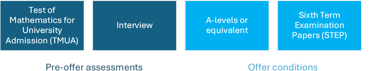 All applicants are now required to take the Test of Mathematics for University Admission (TMUA). This is a computer-based multiple-choice test that assesses mathematical thinking, administered by UAT-UK. There are two sittings of the TMUA and you will need to register for the October sitting. The deadlines for registration for the 2027 cycle will be added to the UAT-UK website in April.